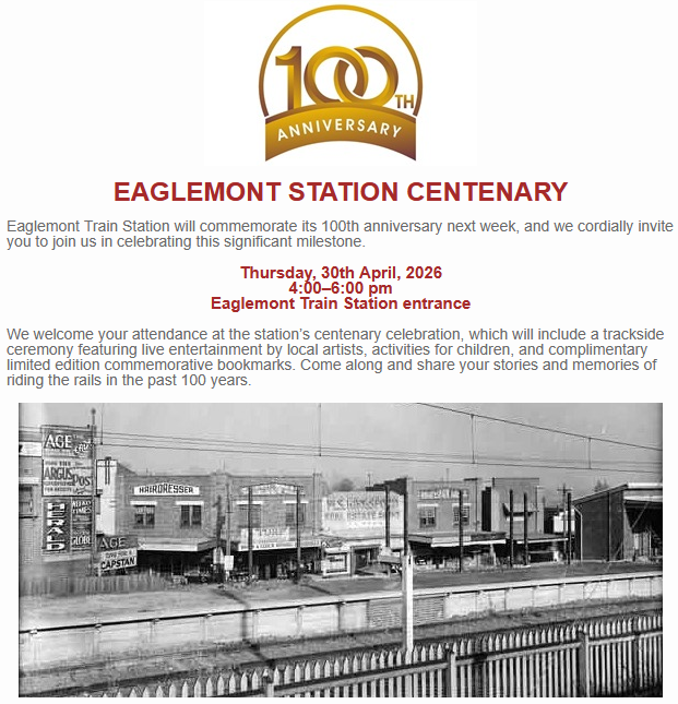 Apr 28, 2026 1 min read Eaglemont Station Centenary celebration Thursday 30th April The Eaglemont Village Traders Association has advised us of this event: