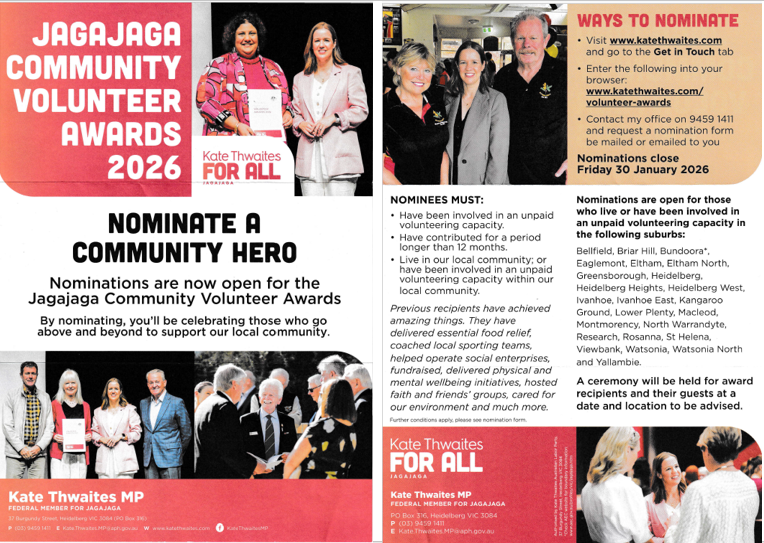 It was a lovely surprise to be reminded that last year we received a Jagajaga Community Volunteer award, with our picture on the front side of the 2026 flyer. If you know a volunteer, or a voluntary group, doing great work in Jagajaga consider nominating them for this year by contacting Kate Thwaites' office. Details on the flyer.