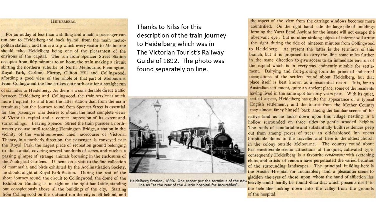 Below is a description of an 1890s train trip from the city to Heidelberg. This was long before you could get on or off at Eaglemont.